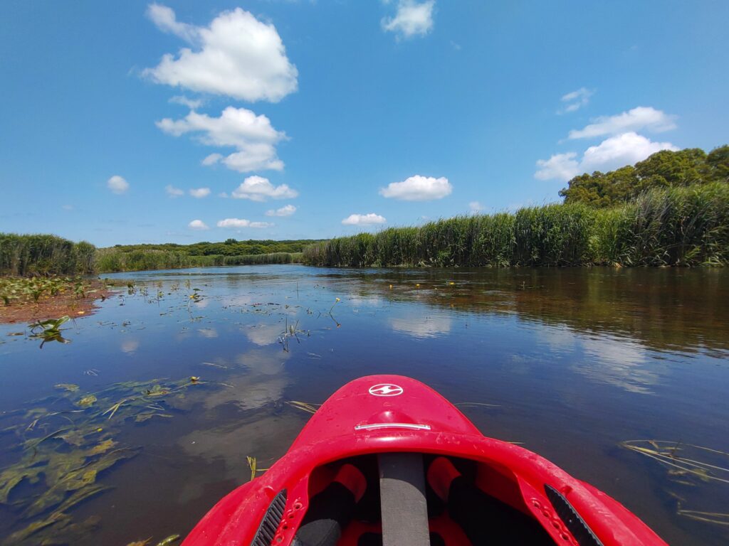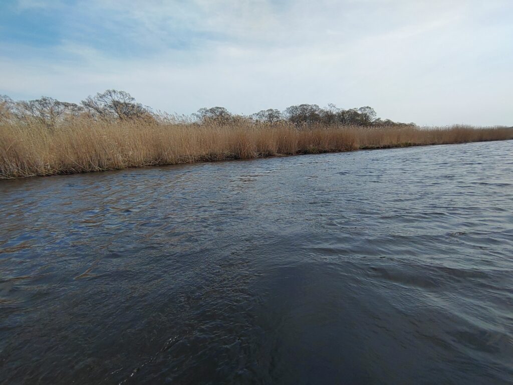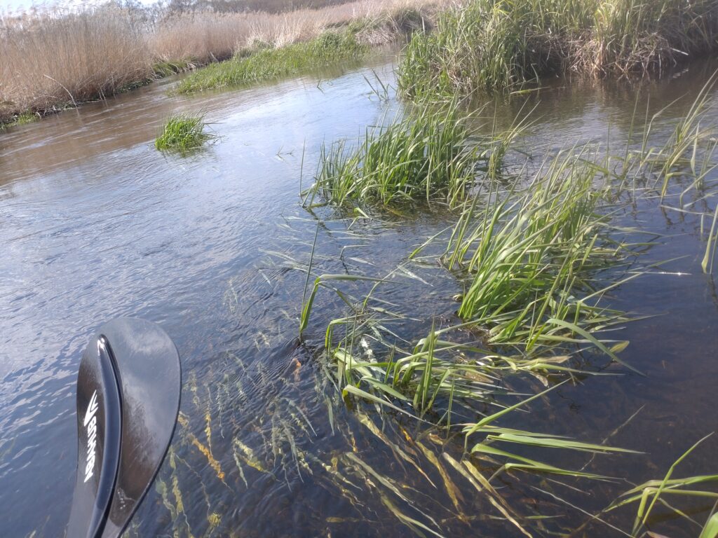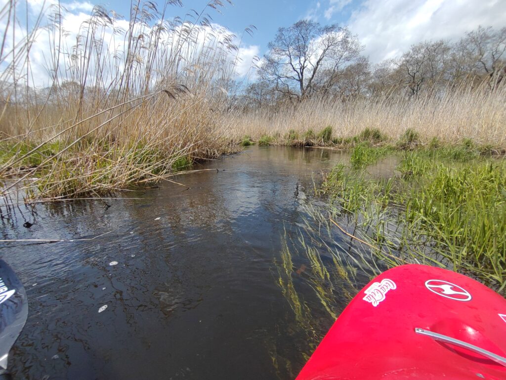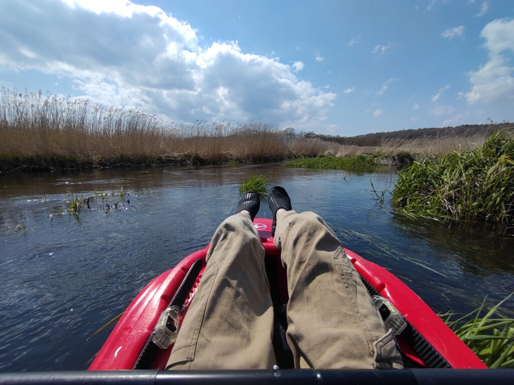 リバーカヤックのコックピットは狭く、30分ほど乗っていると腰が痛くなってくるので、土手や草地帯にわざと乗り上げ座礁させて、行儀は悪いですが足を出して腰を伸ばしてあげます!